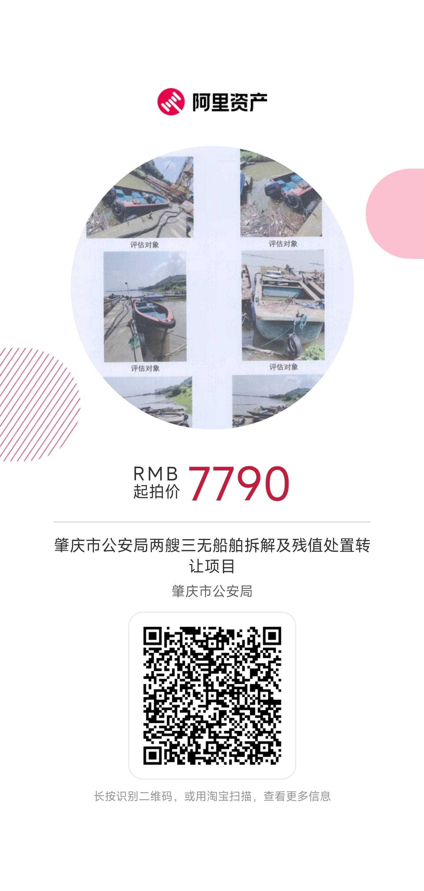 標的物:肇慶市公安局兩艘三無(wú)船舶拆解及殘值處置轉讓項目。